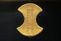 The Taizong Shilu's 3 March 1421 entry notes that the envoys of sixteen countries (Hormuz and other countries) were given gifts of paper money, coin money, ceremonial robes, and linings before the Chinese treasure fleet escorted them back to their countries.[108] The imperial order for the sixth voyage was dated 3 March 1421.[110][111] Zheng He was dispatched with imperial letters, silk brocade, silk floss, silk gauze, and other gifts for the rulers of these countries.[108]