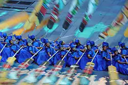 The emperor attended an archery contest for the Midsummer Festival of 1413 (5th day, 5th month, 11th year) that all the Chinese officials and foreign envoys were invited to.[85] Duyvendak (1939) states that these envoys were so numerous that they most-likely comprised many of those whom Zheng escorted back to their countries during the fourth voyage rather than just close neighbors.[85] This expedition led the Chinese treasure fleet into Muslim countries, so it must have been important for the Chinese to seek out reliable interpreters.[86] The interpreter Ma Huan joined the voyages for the first time.[86] A 1523 inscription at a mosque in Xi'an records that, on the 4th month of the 11th year, Zheng was there to seek reliable interpreters and found Hasan (哈三).[86] Hasan was proficient in Arabic and went on this voyage.[87]