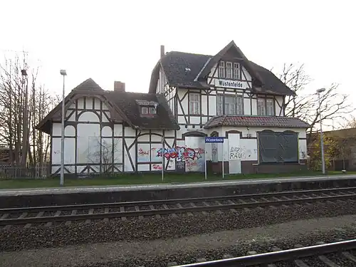 Wüstenfelde (German: Bahnhof Wüstenfelde) is a railway station in the village of Wüstenfelde, Mecklenburg-Vorpommern, Germany. The station lies on the Angermünde-Stralsund railway and the train services are operated by Ostdeutsche Eisenbahn (ODEG).