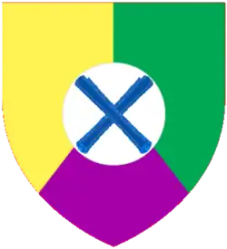 Tierced in pairle reversed Or Vert and Purpure on a plate two scrolls in saltire Azure.