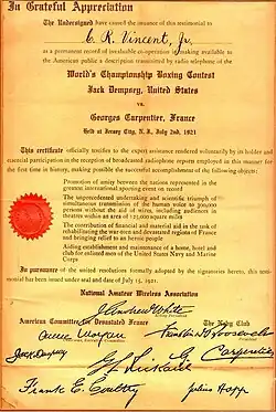 - ^ "July 2nd Fight Described by Radiophone", The Wireless Age, July 1921, page 10.