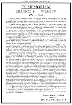 On February 12, 1972, United took WFAN-TV dark, citing the company's financial condition.[20] The February 27 edition of the Washington Post, as well as the next day's issue of Broadcasting magazine, carried a full-page "In Memoriam" ad for WFAN-TV. The ad, taken out by Eaton, diagnosed channel 14 as being "choked to death literally because of lack of power to cover greater Washington", because of the failure of a common tower site for D.C. television stations in 1966 and the hearing-related freeze on later facility improvements, and revealed that in nearly nine years of operation, the television station had lost $1.45 million—$153,000 of that in 1971 alone. Eaton also noted competition from Washington's other independent stations—longstanding VHF independent WTTG-TV and UHF newcomer WDCA—for programming and advertisers.[19] Thirteen employees lost their jobs, while five continued to provide engineering services to the radio stations.[21]