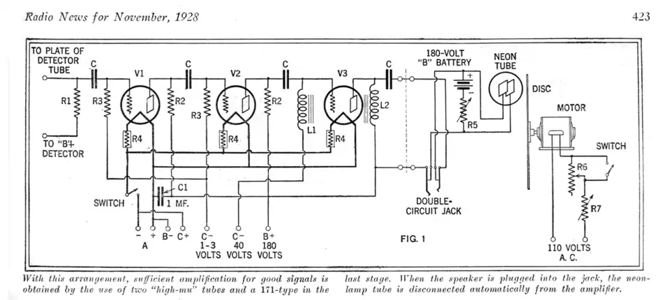 November 1928 WRNY television receiver schematic. The three vacuum tubes (V1, V2 and V3) amplified the radio output to drive the neon lamp.