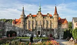 - Town Hall (Ratusz). A representative three-storey building maintained in the style of historical eclecticism, imitating gothic
