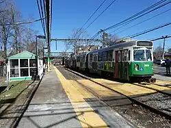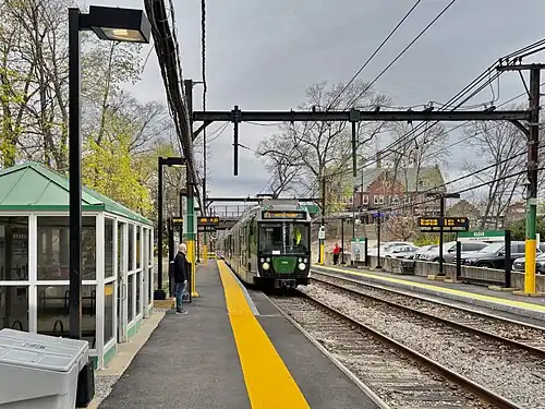 Waban station is a surface-level light rail station on the Massachusetts Bay Transportation Authority's Green Line D branch, located just south of Beacon Street at Waban Square in the Waban section of Newton, Massachusetts. The station is located below grade; access to both platforms is via Wyman Street on the outbound side of the tracks or a stairway from Beacon Street. Waban station was made accessible in October 2024; additional reconstruction is planned to begin in 2026. It is the least-used station on the D branch, averaging 545 daily boardings by a 2011 count.[2]