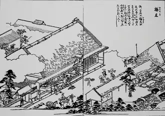 The main building consists of the shop, pharmaceutical factory, kitchen, living areas, with the entrance to the east. The building was a large 10 x 9 bay structure (19.4 x19.1 meters), with a Irimoya-style gabled roof with roof tiles. The current building was rebuilt around 1676. The shop portion of the building has an open front facing the highway with an earthen floor. It is divided into an eastern portion with tatami mat flooring for customers to sit, and a western portion with wooden floor containing a stone mill and wooden gears for the grinding of the medicinal ingredients. The driving wheel has a diameter of 3.6 meters and was also used for demonstrations when making sales. The shop area has a 1.6 meter wide awning with a copper-plate roof. In the back of the eastern portion are a number of palatial residential rooms arranged around a Japanese garden which was designed by Kobori Enshu. Some of the rooms have fusuma doors decorated with paintings by Soga Shōhaku.[6] This is not the residence of the Ōsumi family, but was used as a private space for high-ranking customers. The garden was designated a National Place of Scenic Beauty in 2001.[7]