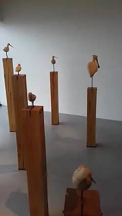 The final room in the exhibition features an artwork of glass with video projections showing the flight of birds.