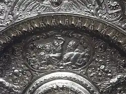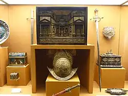 One of the most important objects in the collection is the Ghisi Shield, a parade shield never intended for use in battle, made by Giorgio Ghisi, who was both a goldsmith and an important printmaker. It is signed and dated 1554. With a sword hilt, dated 1570 and now in at the Hungarian National Museum in Budapest, this is the only surviving damascened metalwork by Ghisi. The shield is made of iron hammered in relief, then damascened with gold and partly plated with silver. It has an intricate design with a scene of battling horseman in the centre, within a frame, around which are four further frames containing allegorical female figures, the frames themselves incorporating minute and crowded subjects on a much smaller scale from the Iliad and ancient mythology, inlaid in gold.[37]