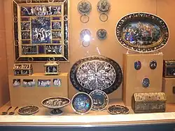 Enamels were made as objects such as candlesticks, dishes, vessels and mirrors, and also as flat plaques to be included in other objects such as caskets. The collection includes all these types, with both unmounted plaques and caskets fitted with plaques. The jolly grotesques illustrated at right are on the reverse of a large dish whose main face shows a brightly coloured depiction of the Destruction of Pharaoh's army in the Red Sea.[41] Both designs are closely paralleled, without being exactly copied, in pieces in other collections, notably one in the Metropolitan Museum of Art in New York. The designs are also based on prints, but adapted by the enamellers for their pieces.[42]