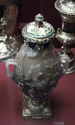 Apart from pieces purely in metal, a number are centred on either hardstone carvings or organic objects such as horns, seashells, ostrich eggshells, and exotic plant seeds.[34] These "curiosities" are typical of the taste of the Renaissance Age of Discovery and show the schatzkammer and the cabinet of curiosities overlapping.[35] A different form of novelty is represented by a table-ornament of a silver-gilt foot-high figure of a huntsman with a dog and brandishing a spear. There is a clockwork mechanism in his base which propels him along the table, and his head lifts off to show a cup, and he would have been used in drinking games. There are separate figures of a boar and stags for him to pursue, though not making a set; these can also function as cups.[36]