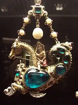 In a collection of Renaissance metalwork Benvenuto Cellini (1500–71) represents the ultimate attribution, as his genuine works as a goldsmith are rarer than paintings by Giorgione. In his 1902 catalogue Charles Hercules Read mentions that many of the pendants had been attributed to Cellini, but refrains from endorsing the attributions.[79] A small silver hand-bell (WB.95) had belonged to Horace Walpole, who praised it extravagantly in a letter as "the uniquest thing in the world, a silver bell for an inkstand made by Benvenuto Cellini. It makes one believe all the extravagant encomiums he bestows on himself; indeed so does his Perseus. Well, my bell is in the finest taste, and is swarmed by caterpillars, lizards, grasshoppers, flies, and masques, that you would take it for one of the plagues of Egypt. They are all in altissimo, nay in out-issimo relievo and yet almost invisible but with a glass. Such foliage, such fruitage!" However Baron Ferdinand had realized that it was more likely to be by Wenzel Jamnitzer, goldsmith to the Emperor Rudolf II, to whom it is still attributed.[80] Another piece no longer attributed to Cellini is a large bronze door-knocker, with a figure of Neptune, 40 cm high, and weighing over 11 kilos.[81]