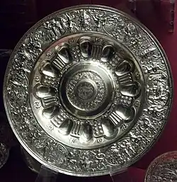 Other major pieces are sets of a ewer and basin, basin in this context meaning a large dish or salver, which when used were carried round by pairs of servants for guests to wash their hands without leaving the table. However the examples in the collection were probably hardly ever used for this, but were intended purely for display on sideboards; typically the basins are rather shallow for actual use. These were perhaps the grandest type of plate, with large surfaces where Mannerist inventiveness could run riot in the decoration. They were already expensive because of the weight of the precious metal, to which a huge amount of time by highly skilled silversmiths was added.[38] The Aspremont-Lynden set in the bequest is documented in that family back to 1610, some 65 years after it was made in Antwerp, and weighs a little less than five kilos.[39]