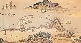 Unlike the Ming dynasty's policy of haijin (restricting maritime trade), Korea permitted free entry of ships into its ports. As a result, trade between the Joseon and Japanese feudal lords increased rapidly. When Joseon harbors became targets for wokou pirates, in 1407, King Taejong restricted Japanese ships to the ports of Busan, Naei, and Yeom.[1] By 1410, all forms of Japanese communication, including entrance of envoys and messengers, known to Koreans as Chŏbwae (접왜; 接倭), were also restricted to these ports. Originally intended only as a stop for Japanese ships, these ports soon became hotspots for Japanese residents and their families, primarily arriving from Tsushima Island, forming the first waegwan ethnic enclaves called sampo (삼포; 三浦; lit. three ports).[1][2]