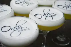 Edible ink printed on wafer paper, floated atop cocktail foam