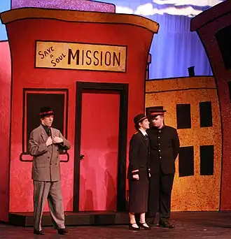 A scenery wagon, also known as a stage wagon, is a mobile platform that is used to support and transport movable, three-dimensional theatrical scenery on a theater stage. In most cases, the scenery is constructed on top of the wagon such that the wagon, and the scenery it supports, forms a single, integrated structure. Heavy duty casters are mounted to the underside of the platform so that the entire assembly can be quickly moved onstage or offstage, so as to facilitate rapid scenery changes during live productions. Scenery wagons are built in a wide range of sizes, ranging from less than one square foot up to the size of the playing area of the stage.[1]