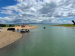 The area used by the boat ramp (since 2001)[6] and car park is part of a delta formed by the river.[7] Shingle was taken off the delta from at least 1920[8] to 1937.[9] The 219 ton[10] Devonport Steam Ferry paddle steamer Eagle[11] (1886-1924)[12] was on the beach at least from 1925[13] to 1927.[14] Former Auckland tram bodies were moved to the south end of the delta in 1953 for use as holiday baches.[15] Ngāati Tamaterā regained the delta and other areas under a Settlement dated 20 September 2017,[16] following Land Court irregularities dating back to 1878.[6]