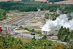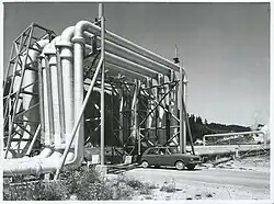 The power station was built in 1958, the first of its type (wet steam) in the world, and it is currently owned and operated by Contact Energy. A binary cycle power plant was constructed in 2005 to use lower-temperature steam that had already gone through the main plant.[2][3] This increased the total capacity of the power station to 181 MW.[1] The Wairakei power station is due to be phased out in 2027, replaced by the Te Mihi geothermal power station.[4] The Poihipi Power Station was built in 1996 at a nearby site in the same field.[2]