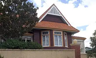 Wairuna is a substantial mostly one storeyed elevated timber building on a prominent site in Hampstead Road, Highgate Hill. The building has a complex steeply pitched hipped and gabled roof clad with red Marseilles patterned terracotta roof tiles. Gabled projections on the roof give external expression to bay windows and other projections which would otherwise be concealed by verandahs. The gabled projections on the roof are clad with a variety of small terracotta tiles or horizontal timber boarding. The projections have decorative bargeboards partially infilled with either vertical timber battening or cross braced timber members.[1]