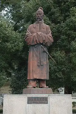 Wake no Kiyomaro (和気 清麻呂; 733–799) was a high-ranking Japanese official during the Nara period. He was born in Bizen Province (now Wake, Okayama) to a family of politically important, devoted Buddhists who hoped to keep Buddhism and politics separate through religious reform. He became a trusted advisor to Emperor Kanmu, a position which he used to encourage the development of Buddhism in a direction which would prevent it from posing a threat to the government.[1][2] According to the Shoku Nihongi, he was sent to the Usa Shrine to receive a divine message; stating that only those of descent from Amaterasu could become emperor, it refuted the previous divine message claiming Dōkyō was to be the next emperor after Empress Kōken (later Empress Shōtoku).[3] This report angered Dōkyō, who used his influence with the Empress to have an edict issued sending Kiyomaro into exile; he also had the sinews of Kiyomaro's legs cut, and only the protection of the Fujiwara clan saved him from being killed outright.[4]