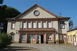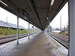 Waldheim station was opened in 1852 when the line between Limmritz and Chemnitz, the last section of the Riesa–Chemnitz railway, was opened. Despite the fact that two branch lines — the Waldheim–Rochlitz railway and the Waldheim–Kriebethal railway which was opened 1896 - joined the mainline here, the track plan of this junction station remained comparatively simple. In the last years of the line there was only one track with a run-around loop for the locomotives of the Rochlitz trains. They used the island platform which at this time had remained the only platform in the station (a second platform without a canopy had been removed when the mainline was re-doubled and electrified). The opposite side of the island platform was and still is used by the mainline trains between Riesa and Chemnitz. With the building work progressing, the Rochlitz track was joined to the mainline, too, but is hardly used any more. The station building had stood empty and suffered from increasing decay for several years until most of it was demolished in 2015, leaving only the porticus.[22][23] The long goods shed and the engine shed that was accessible via a turntable are also abandoned and decaying. The engine shed used to house locomotives for shunting duties and for the freight services to the paper mills in the Zschopau valley. Some team tracks have remained in use for a few years after closure of the WR line,[24][18] but now (2016) only a passing loop and two crossovers between the mainline tracks are left beside the latter.[25]