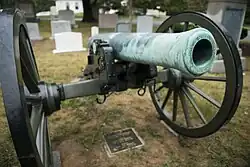 His grave marker is one of the most idiosyncratic in Arlington National Cemetery. His resting place, including that of his wife and two daughters, is marked by a twelve-hundred-pound Napoleon cannon.[35] The brass fieldpiece, cast in 1862 and believed to have been used in combat during the American Civil War, was placed shortly after his funeral.[36]