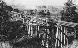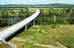 In 1929, an existing cane train bridge over the Burnett River was converted to be suitable for use by cars. As well as being convenient for local use, it also allowed those travelling between Brisbane and Rockhampton to bypass Bundaberg, which shortened the journey by 80 miles (130 km). It was funded by a local committee and was officially opened on 12 October 1929 by the Member for Burrum William Brand.[12][13] The bridge proved popular but soon the maintenance costs become too much for the local volunteers to fund so in 1934 they sought financial assistance from the local Isis Shire Council. However, as the other side of the Burnett River was in the Kolan Shire, the Isis Shire Council sought to spread the cost across both shires.[14] This lead in 1934 to a request to the Queensland Government to fund a new more permanent road bridge.[15] While the issue of funding remained unresolved, the lack of maintenance was taking its toll with the bridge and its approaches being described as "a bit of a nightmare" with recommendations to drive via Bundaberg instead.[16] The Queensland Government approved £11,825 for the construction of a new bridge in September 1938;[17] however, construction was delayed due to a shortage of steel.[18] The bridge was finally opened on Saturday 11 May 1940 by Harry Bruce, the Queensland Minister for Public Works, who outlined his vision for a highway from Coolangatta to Cooktown (of which the present day Bruce Highway from Brisbane to Cairns forms the major part). The new Wallaville bridge was a low-level concrete bridge 690 feet (210 m) long (25°05′07″S 151°59′42″E / 25.0853°S 151.9949°E).[19]