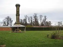 The chimney stack to the former greenhouse is built of sandstone and about 9 metres (30 ft) high. There are three stages on a three-course plinth with a moulded base. In each stage are panels with rock-faced rustication. The bottom stage has a row of circular flues, modillions and a moulded cornice, and the upper stages are divided by a band with a circular motif. It is grade II listed.[8]