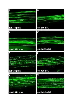 - ^ Fujiki M, Zhang Z, Guth L, Steward O (July 1996). "Genetic influences on cellular reactions to spinal cord injury: activation of macrophages/microglia and astrocytes is delayed in mice carrying a mutation (WldS) that causes delayed Wallerian degeneration". The Journal of Comparative Neurology. 371 (3): 469–84. doi:10.1002/(SICI)1096-9861(19960729)371:3<469::AID-CNE9>3.0.CO;2-0. PMID 8842900. S2CID 8797673.