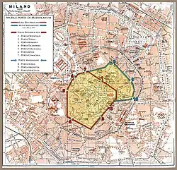 Map of the Roman walls of Milan. The Republican walls are shown in red, the Imperial (Maximian) walls in blue