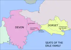 22 October 1549 at Colyton,[24] he married Mary Wyke, the third of four daughters and co-heiresses of Richard Wyke of Bindon in the parish of Axmouth, Devon, three miles south-east of Colcombe. Richard Wyke was a great-grandson of Roger Wyke (died c. 1467) (alias Wykes, Wycke, Wick, Wicks, Weeke, etc.), a Member of Parliament for Plympton Erle,[25] Devon, in 1413, a younger son of William Wyke of North Wyke in the parish of South Tawton in Devon. Richard Wyke died without sons, leaving four daughters and co-heiresses. Mary's share of her paternal inheritance included Bindon and a moiety of her father's larger estate at Charborough in Dorset. Erle re-purchased the other moiety from Alice Wykes, Mary's elder sister, and made it his principal residence.[14] By his wife he had children as follows: