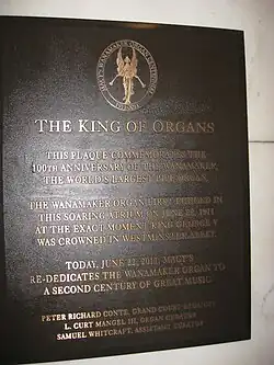 The Wanamaker Organ was the largest fully functioning pipe organ in the world, based on the number of playing pipes, the number of ranks and its weight.[3][4] It is a concert organ of the American Symphonic school of design, which combines traditional organ tone with the sonic colors of the symphony orchestra. In its present configuration, the instrument has 28,762 pipes in 464 ranks.[5]