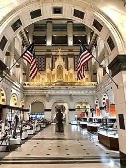 The display pipes of the Wanamaker Organ. These pipes are decorative only. The pipes that sound are behind and above them. Store architect Daniel Hudson Burnham designed the organ casework.[1][2]