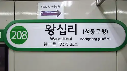 6. ^ "왕십리역" (in Korean). 철도역 정보. Retrieved 19 July 2019.