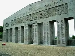 Bigot built a 31 metre long monument which consisted of nine columns supporting one huge pediment and on these columns are inscribed the names of those who died in the Great War, whether as soldiers or civilians killed during the German occupation. On the pediment itself are three bas-reliefs. That at the centre shows life in the trenches and scenes from the civilian exodus of March 1917 and at each end are bas-reliefs, one depicting a scene from 1870 and the other remembering the conflict of 1557. The wording on the monument was subsequently changed to remember those who had lain down their lives in the 1939–1945 conflict.[23] |