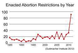 Democratic strategist Zerlina Maxwell wrote an editorial for U.S. News & World Report in which she cited a Guttmacher Institute analysis showing state legislatures enacted 135 pieces of legislation affecting women's reproductive rights as evidence that the "Republican 'War on Women' is no fiction."[10] The analysis found that between 2000 and 2011, the number of states hostile to abortion rights have increased markedly, and that in 2011 there was an unprecedented rise in the number of provisions passed by state legislatures restricting abortion.[50]