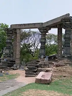 While the Shiva temple had been completely destroyed, there are many ruins of "wall slabs, brackets and ceiling panels", some of which are exhibited now in an outdoor museum. There are still some standing pillars ("temple spoilia") that the Bahmani Sultanate (14th-16th century) earlier used to build a mosque, which remained incomplete.