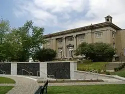 The Carnegie Library was one of the early Carnegie libraries funded in Indiana by Andrew Carnegie, to the tune of $15,000. The Neo-Classical architecture was done by Arthur Loomis, a nationally respected architect in the firm of Clarke & Loomis Architecture, with the cornerstone being set on September 19, 1903.[4] Loomis was a native of Jeffersonville. The building once held classes for Indiana University Southeast. The Carnegie Library is the central focus point in Warder Park and now contains the Remnant Trust of Rare Books and Documents.