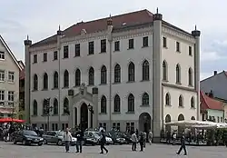 The third, three-storey, New Town Hall (Neues Rathaus) was built from 1791 to 1797 in a historicist tudor style. The corners of the plastered building were emphasised with slender, turret-like columns. The surrounding crenellations (Zinnenkranz) runs around the base of the hip roof and is interrupted on the longer sides of the building by two additional turrets. There is an open arcade on the right-hand side.