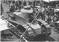 Because their soldiers were not able to use or take proper care of modern weapons, the warlords often hired foreign mercenaries, who were effective but always open to other offers. Russian émigrés who fled to China after the victory of the Bolsheviks were widely employed. One of the Russian mercenaries claimed that they went through Chinese troops like a knife through butter during one battle. The most highly paid of the Russian units was led by Gen. Konstantin Nechaev, who fought for Zhang Zongchang, the "Dogmeat General" who ruled Shandong province. Zhang Zongchang had Russian women as concubines.[38][39] Nechaev and his men were much feared. In 1926 they drove three armoured trains through the countryside, gunning down everyone they met and taking everything moveable. The rampage was stopped only when the peasants pulled up the train tracks, which led Nechaev to sack the nearest town.[40] Nechaev suffered a huge defeat at the hands of Chinese, when he and one armoured train under his command were trapped near Suichzhou in 1925. Their Chinese adversaries had pulled up the rail, and took this opportunity to massacre almost all Russian mercenaries on board the train. Nechaev managed to survive this incident, but lost a part of his leg during the bitter fighting.[41] In October 1926, Nechaev had 6 good armored trains, representing a significant military force.[42] In 1926 Chinese warlord Sun Chuanfang inflicted bloody death tolls upon the White Russian mercenaries under Nechaev's brigade in the 65th division serving Zhang Zongchang, reducing the Russian numbers from 3,000 to only a few hundred by 1927 and the remaining Russian survivors fought in armored trains.[43] During the Northern Expedition Chinese Nationalist forces captured an armoured train of Russian mercenaries serving Zhang Zongchang and brutalized the Russian prisoners by piercing their noses with rope and marching them in public through the streets in Shandong in 1928, described as "stout rope pierced through their noses".[44][45][46][47][48]