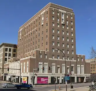 The building is eleven stories tall, and rises 128 feet (39 m) above the ground.[2] The building was designed by Kansas City architect Alonzo H. Gentry in the Art Deco style. The brick exterior features terra cotta ornamentation. The hotel opened on December 20, 1930, built by the Eppley Hotel Company.[3] Eppley was bought by Sheraton Hotels in 1956, and the hotel was renamed the Sheraton-Warrior.[3] Sheraton remodeled the hotel in 1962, moving the lobby from the second floor to the ground floor and converting the hotel to a motel, renaming it the Sheraton-Warrior Motor Inn.[3] In 1968, Sheraton sold the hotel to Gotham Hotels Limited, along with seventeen other aging properties, and it was renamed the Warrior Motor Inn.[3] The hotel closed in 1971 following a strike by employees, but was sold and reopened the following year as the Aventino Motor Inn.[4] It closed permanently in 1976.[5] It was listed on the National Register of Historic Places in 1985.[1]