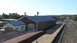 The Goods Shed is a single-storeyed sandstone building, situated to the north of the Station. A narrow linear building on a north–south axis, it measures some 70 metres (230 ft) in length by 11 metres (36 ft) in width. The gabled roof is of corrugated iron, with translucent skylight panels and a deep overhang on the western side protecting the loading bays. The stonework is of picked finish with draughted margins, laid as coursed ashlar. Added to the south of the building is a small timber office, and to the west is a recent steel canopy structure. Inside the building is a railway siding, with the remainder being a timber platform. The building is still in use as a goods shed.[1]