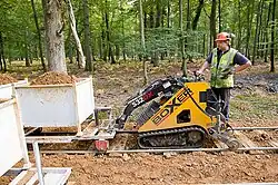 The contractors were Alaska Environmental Contracting.[4] They used 8, 13 and 18 tonne hydraulic excavators, 10 tonne rubber tracked dumper trucks and an innovative light railway.