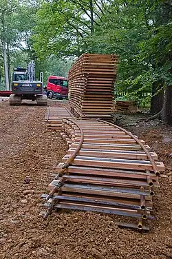 The track laying began on 2 September 2009 along a wide, grassy forest track. The track consisted of circular steel pipe of about 6mm wall thickness, welded to steel cross members which were in turn bolted to wooden sleepers. One side was fitted with a steel spike to engage with the next section. Thus, it fitted together very much like a toy railway, using preassembled track sections which are either straight or of fixed curvature.[1] The track laying operation looked a bit like a child’s train set on a large scale. The rails, with sleepers ready attached, came in sections - straight or curved to suit their position. The tube and pin joints fitted together exactly as do the rail sections of the toy set.[6]