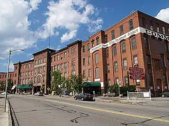 The complex is located north of downtown Worcester, between Grove and Prescott Streets north of Faraday Street. It consists of thirteen brick buildings, the oldest of which was built in 1863. Located at the southern end of the complex, the Cotton Mill manufactured cotton that was used to wrap crinoline wire that was used in hoop skirts. When hoop skirts went out of fashion, the building was converted to produce wire. Originally a three-story building, it was raised to four between 1888 and 1892.[5]