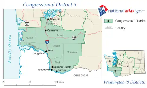 Washington's 3rd congressional district encompasses the southernmost portion of Western Washington. It includes the counties of Lewis, Pacific, Wahkiakum, Cowlitz, Clark, and Skamania; as well as a small portion of southern Thurston county.