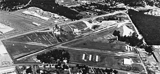The airport featured two graveled runways, a north–south runway measuring 2,200 feet and a second, longer runway that ran east–west and measured 2,800 feet. During the late 1940s, the Benn brothers opened a flight school that included 10 Piper J-3 Cubs, two Cessna 120s, a Cessna 140, a Fairchild PT-19 and a Cessna UC-78 Bobcat in its inventory. The airport also had multiple hangars and administrative offices.[1] By 1949, the airport was considered as one of the busiest general aviation airports in the Washington D.C. metropolitan area and attracted a number of airshows and events.[7][8][9]