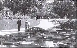 One of the earliest improvements was the "South Open Green", a pastoral meadow with grazing sheep, also used as a ball field. Architect Daniel H. Burnham's firm designed the 1880 limestone round stables, the 1881 refectory, and the 1910 administrative headquarters for the South Park Commission. Other early attractions to the park included riding stables, cricket grounds, baseball fields, a toboggan slide, archery ranges, a golf course, Swimming pool, bicycle paths, row boats, horseshoe pits, greenhouses, a rose garden, a bandstand, a small zoo featuring six alligators, and a lily pond.[4] The lily pond (pictured left) was a particularly enticing attraction because few had seen such a site.[3] Today, the administrative building houses DuSable Museum of African American History.[6] The park has retained its environmental appeal with continuing visionary support of the Burnham Plan which supported the maintenance of a park system.[11]