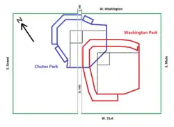 In the 1910–1911 off-season, the old ballpark and some of the rides were demolished, and a new ballpark was built within the same large block. Sanborn maps show that the new infield and covered stands were positioned south and east of their predecessor, overlaying the centerfield area of the old park and much of the former waterslide area. Hill Street was eventually cut through the western portion of the large block. The new ballpark bordered Hill Street on its first base side, and was set back from Washington (third base), Main (left field) and 21st (right field). Some local newspapers dubbed it "Washington-Street Park", but "Washington Park" was the prevailing reference.