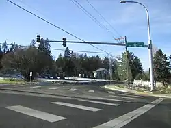 SR 96 begins as 128th Street at a diamond interchange with I-5 in Paine Field-Lake Stickney, located in suburban Snohomish County south of Everett.[3] The highway travels east and crosses the Interurban Trail and North Creek before turning southeast onto 132nd Street and entering the city of Mill Creek.[4] SR 96 passes north of McCollum Pioneer Park and Henry M. Jackson High School before it intersects SR 527 at a commercial center known as Murphy's Corner. The highway continues east and passes Archbishop Murphy High School before turning northeast onto Seattle Hill Road and ascends the eponymous hill into Silver Firs. SR 96 descends southeast into the Snohomish River valley from Larimers Corner to Rees Corner on 131st Street, ending at an intersection with SR 9 south of Snohomish.[5][6]