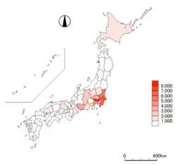 Thai residents in Japan are concentrated in the Greater Tokyo Area, with the largest number of Thai residents in Tokyo, Chiba, Ibaraki, Kanagawa, and Saitama prefectures, in that order, with Chiba Prefecture having the second largest number of Thai residents in Japan.[15]